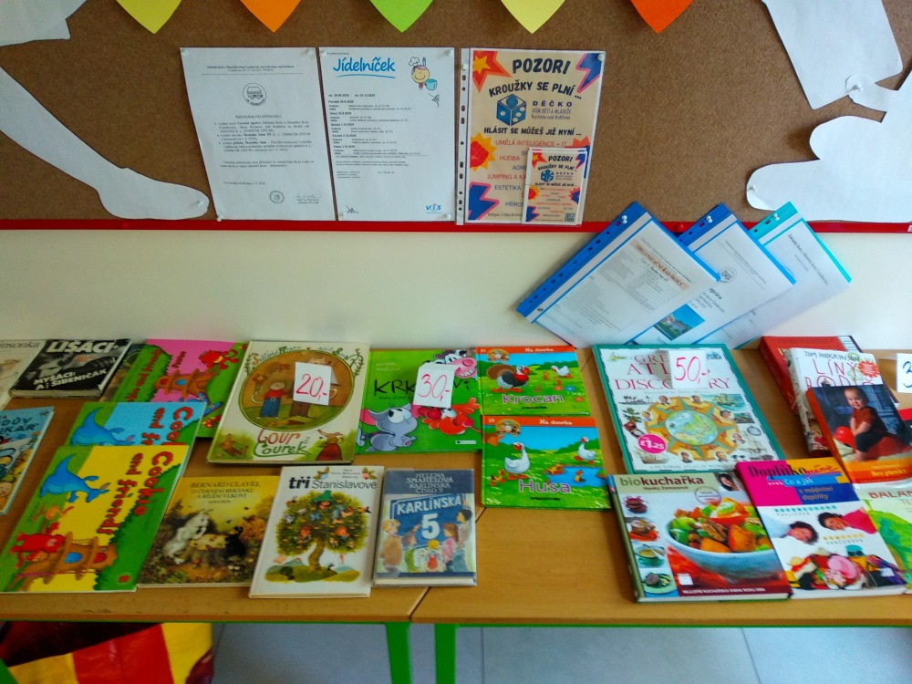 Se začátkem nového školního roku 2025/2026 jsme požádali rodiče, zda by mohli přinést a do našeho bazárku věnovat knihy, které již doma nepotřebují. Díky jejich aktivnímu přístupu, jsme mohli v týdnu od 22. září uspořádat bazar dětských knih, kuchařek i knih pro dospělé. Mnohokrát děkujeme za přispění a doufáme, že nad nově nabytými knihami stráví žáci i rodiče mnoho hezkých chvil. Všechny získané peníze plánujeme použít na nákup nových knih do žákovské knihovny ve škole a samozřejmě i pro práci v hodinách.